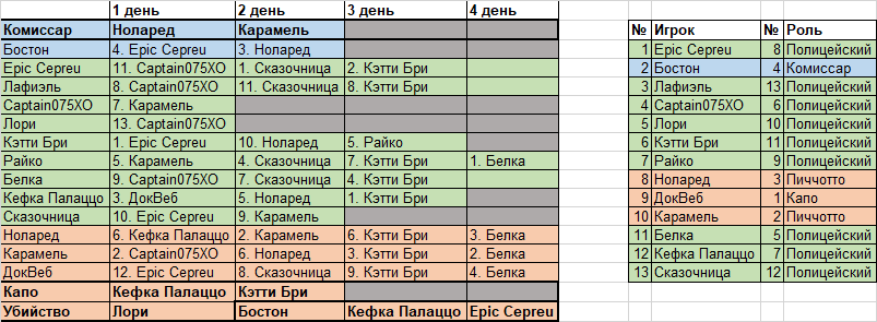 Роли игроков, покинувших игру раскрываются Ведущим.